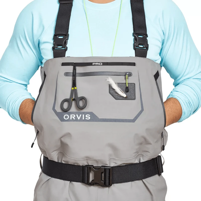 The Orvis PRO Wader is built for the professional angler whether by trade or simply by passion who will go to whatever extreme necessary to find fish. Built with an athletic fit, the PRO Wader uses an extremely durable proprietary 4-layer Cordura fabric shell in the upper and 5-layer Cordura fabric shell in the lower legs for the best in class abrasion and puncture resistance. Low profile seam construction and a gusseted crotch enhance movement and seam strength. Modern anatomically correct neoprene booties have less bulk with a true “sock” feel and are more comfortable inside wading boots, while the streamlined PU reinforced mesh gravel guard covers the boot tightly and completely eliminates drag and water collection.Convenience features include an external storage pocket with YKK AquaGuard water-resistant zipper to keep essentials dry and prevents loss. Rubberized tabs on suspenders and front pocket daisy chain for tool docking, offer multiple locations for essentials and eliminate chance of puncturing waders or losing tools. Fly patch on front pocket for quick changes and drying. Large four-way stretch power mesh interior pocket expands to fit larger items yet stays out of the way when empty. Kangaroo-style fleece-lined handwarmer pockets with YKK AquaGuard water-resistant zippers. Removable OrthoLite knee pads use the same technology found in the PRO Boot insole for optimal comfort and rebound. Removable accessory pocket allows for quick access to gear and offers the features of a small pack. Adjustable elastic suspenders with opposing buckles for waist-high conversion. Interior hook-and-loop patch accommodates the Orvis waterproof pocket.