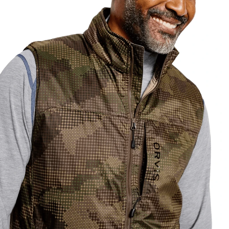 The Men’s PRO Insulated Vest layers on warmth without bulk for every cold-weather fishing trip. Orvis PRO fishing apparel is the most technologically advanced outerwear Orvix has ever built. Using a combination of technical fabrication and action-specific design, Orvis PRO apparel takes on the elements and provides the protection necessary in even the harshest environs. The Men’s PRO Insulated Vest uses body-mapped insulation to provide optimal temperature control through a wide range of activity level and environments. 80g PrimaLoft Gold Active insulation (45% recycled content) protects the body’s core, with weightless, highly packable warmth ideal for active pursuits. Polartec Alpha (80g) (55% recycled content), designed for Special-Ops teams, regulates body heat and moisture through the side panels allowing the vest to be comfortably worn through a wide range of temperatures and activities. The outer is a 20D mechanical stretch ripstop nylon shell with unique coating to improve wind and weather resistance. Zippered, fleece-lined hand-warmer pockets, zippered chest pocket for storage, and internal zippered security pocket that doubles as a stuff sack. High-quality YKK zippers and DWR (Durable Water Repellent) coating. Active fit ideal for layering.